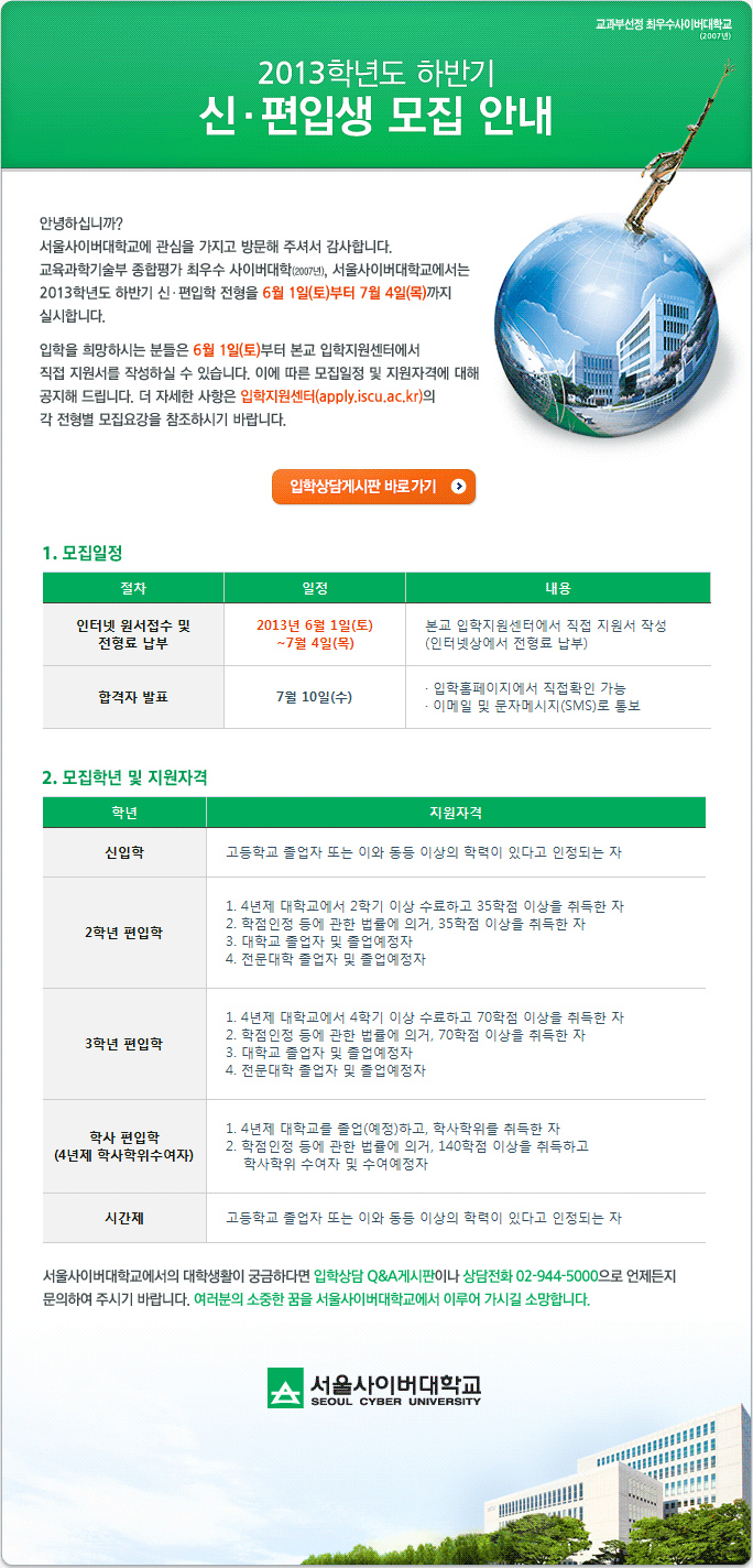 2013학년도 하반기 신·편입생 모집 안내