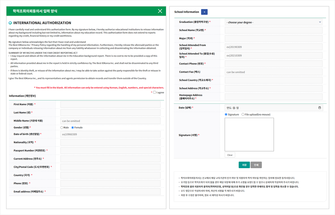 - 해당 서식은 본교에서 해당 교육기관의 인가 여부 및 지원자의 학적 여부를 확인하는 절차에 필요한 동의서입니다.